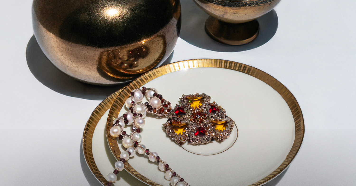 COMPOSITION: VINTAGE GLASS, FRESHWATER PEARLS, GREEN GARNET GEMSTONES, SILK AND METALLISED THREADS, AND MOTHER OF PEARL BUTTON.