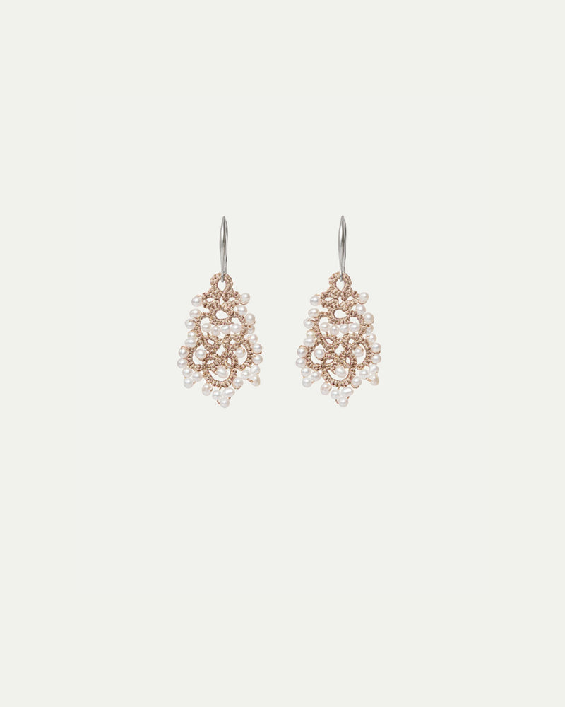 COMPOSITION: FRESHWATER PEARLS, SILK AND METALLIZED THREADS, AND SILVER HOOKS.