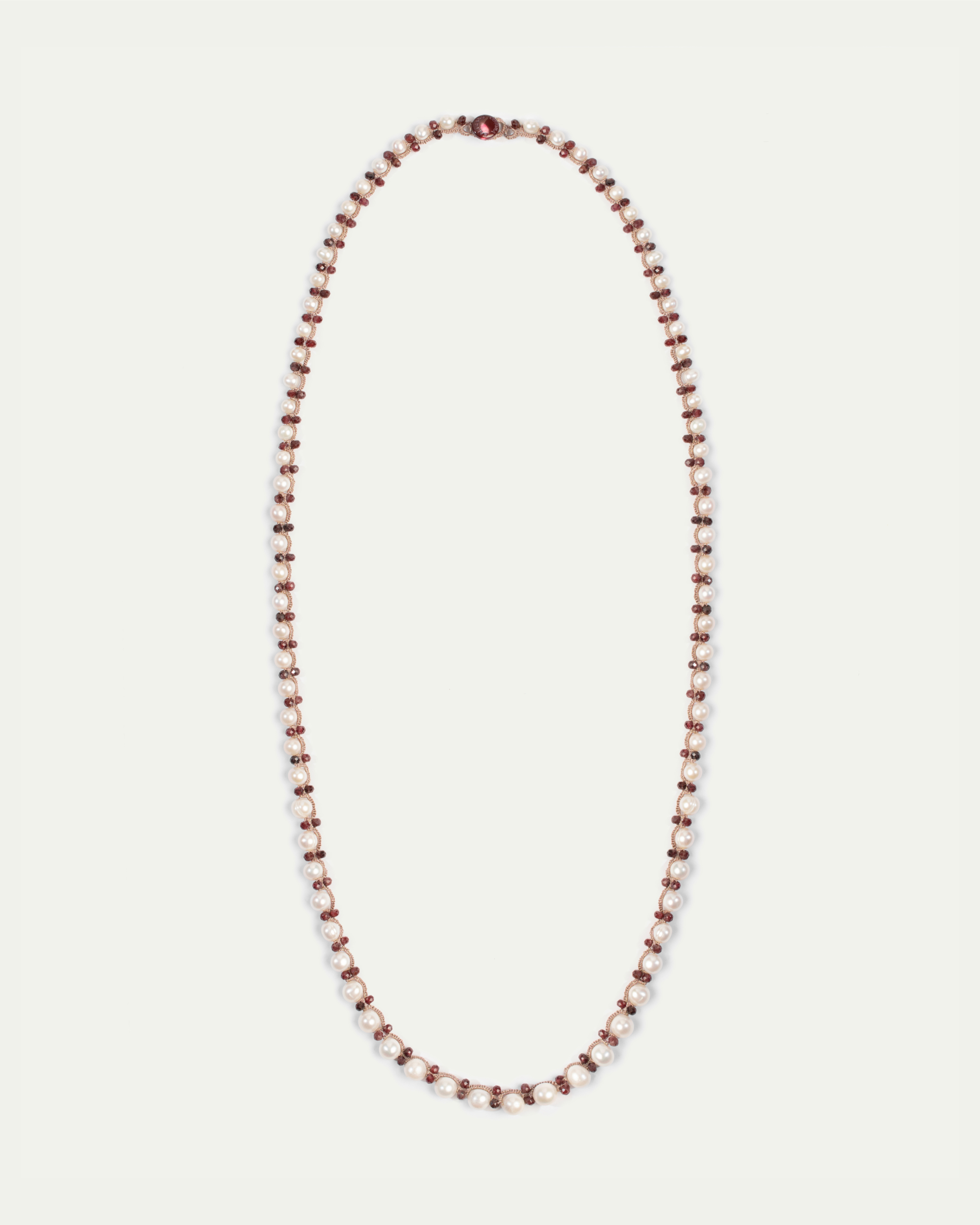 COMPOSITION: FRESHWATER PEARLS, GARNET GEMSTONES, SILK AND METALLIZED THREADS, AND MOTHER OF PEARL BUTTON.