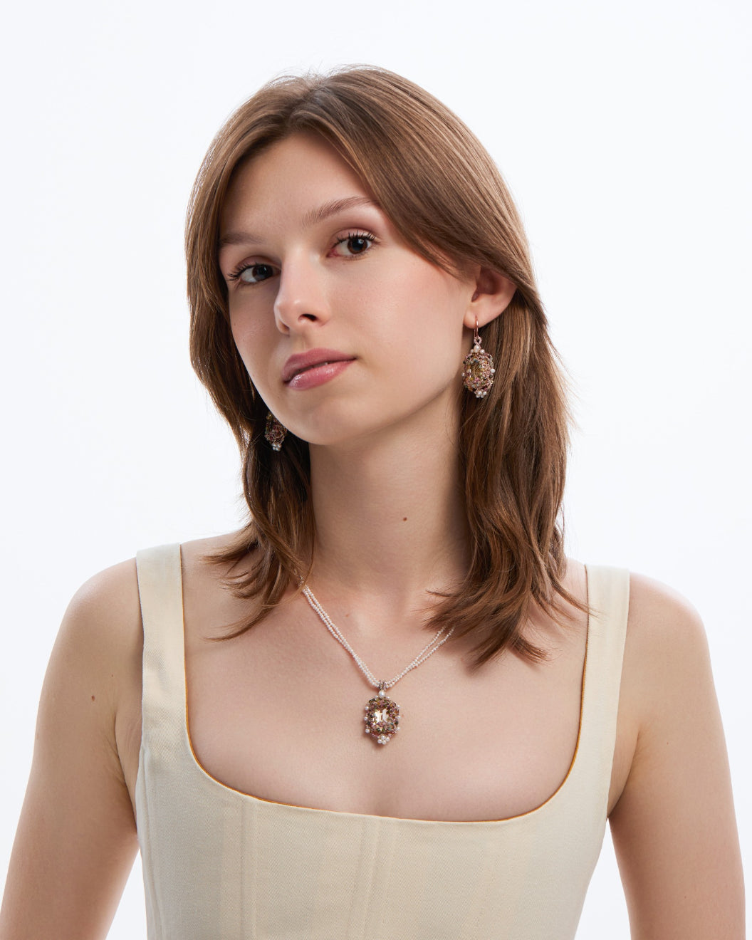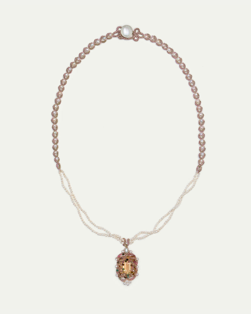 COMPOSITION: CRYSTAL, TOURMALINE GEMSTONES, FRESHWATER PEARLS, SILK AND METALLIZED THREADS, AND MOTHER OF PEARL BUTTON.