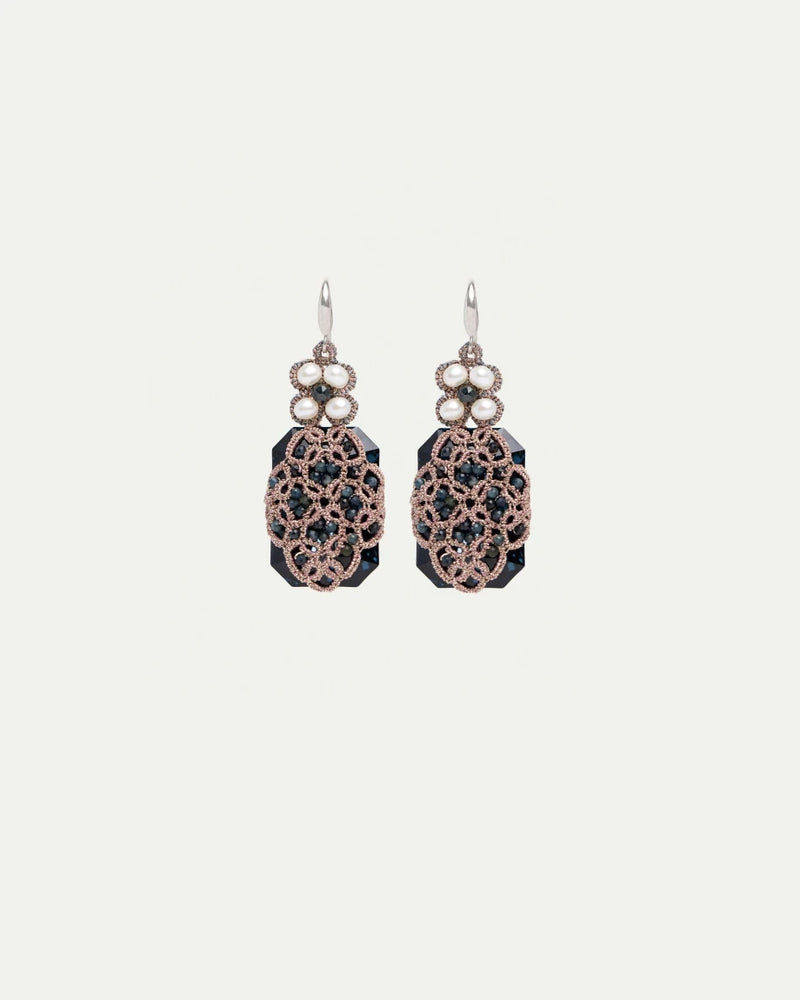 COMPOSITION: CRYSTAL, BLUE TOURMALINE GEMSTONES, FRESHWATER PEARLS, SILK AND METALLIZED THREADS, AND SILVER HOOKS.