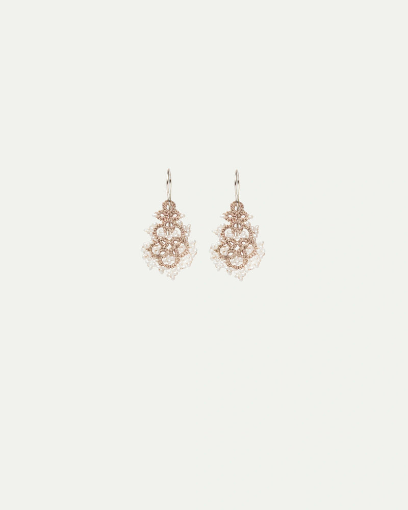 COMPOSITION: FRESHWATER PEARLS, SILK AND METALLIZED THREADS, AND SILVER HOOKS.