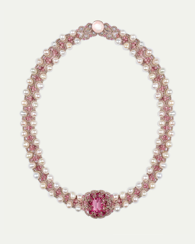 COMPOSITION: CRYSTAL, FRESHWATER PEARLS, RUBY AND PINK TOURMALINE GEMSTONES, SILK AND METALLIZED THREADS, AND MOTHER OF PEARL BUTTON.