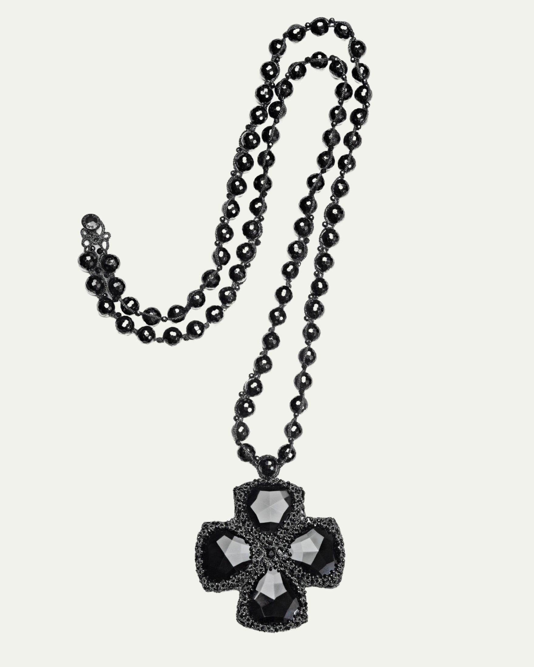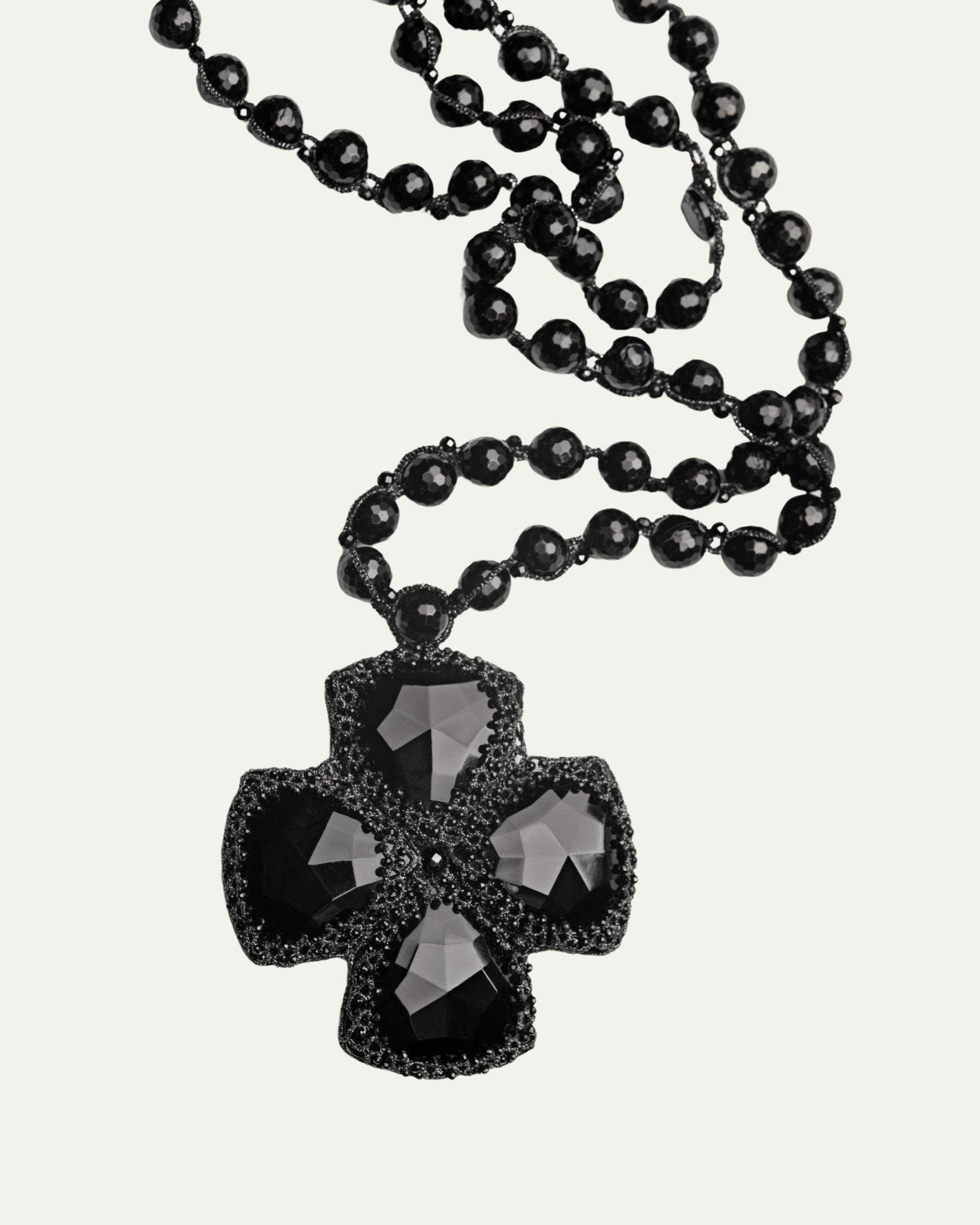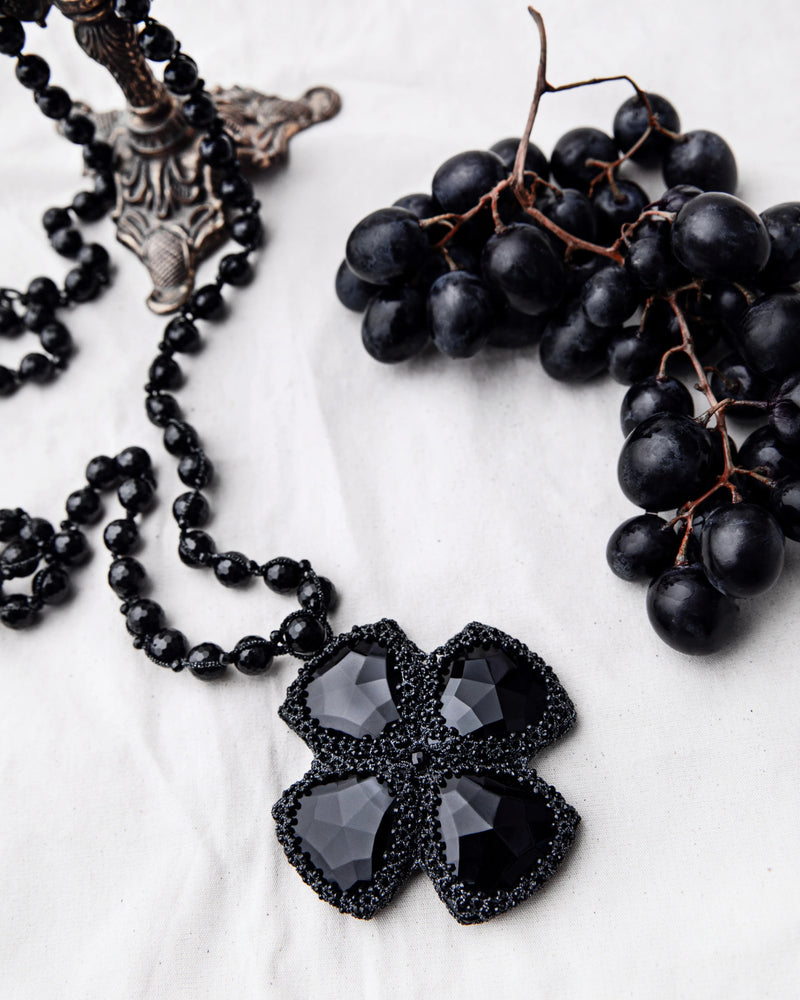 COMPOSITION: VINTAGE GLASS, SPINEL GEMSTONES, SILK AND METALLIZED THREAD, AND MOTHER OF PEARL BUTTON.