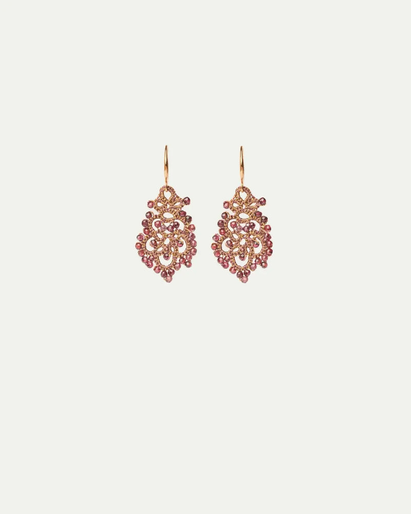 COMPOSITION: GARNET GEMSTONES, SILK AND METALLIZED THREADS, AND GOLD-PLATED SILVER HOOKS.
