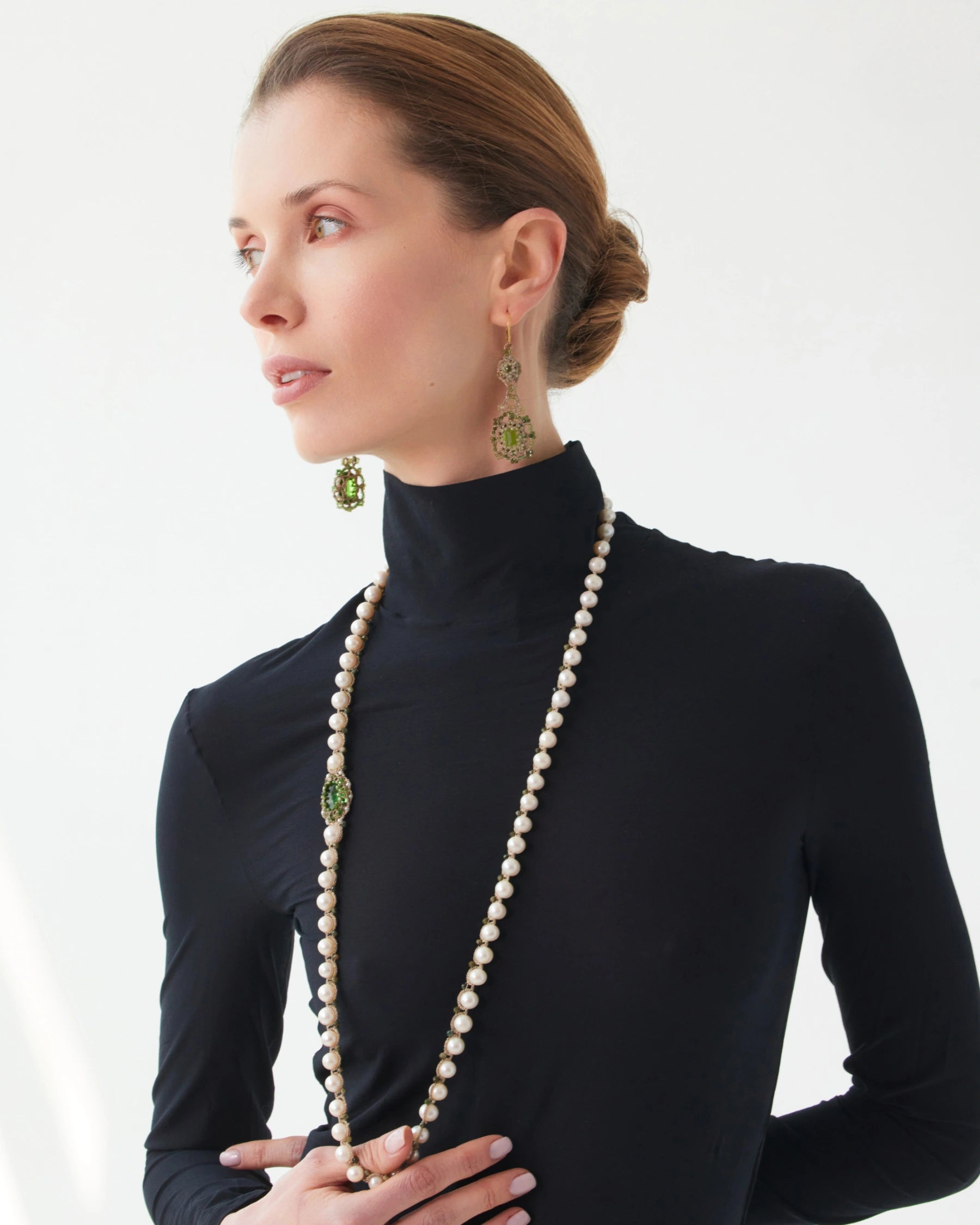 COMPOSITION: CRYSTAL, GREEN TOURMALINE AND DARK GREEN TOURMALINE GEMSTONES, SILK AND METALLIZED THREADS, AND GOLD-PLATED SILVER HOOK.