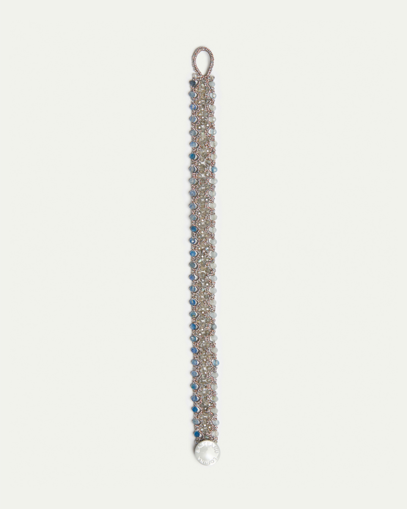 COMPOSITION: AQUAMARINE, KYANITE AND LABRADORITE GEMSTONES, SILK AND METALLIZED THREAD, AND MOTHER OF PEARL BUTTON.