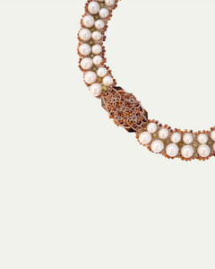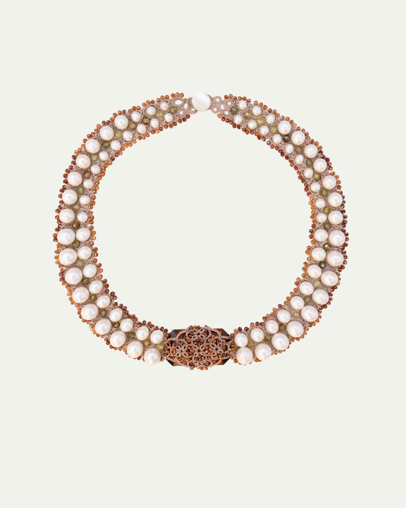 COMPOSITION: VINTAGE CRYSTAL, ORANGE AND GREEN GARNET GEMSTONES, FRESHWATER PEARLS, SILK AND METALLIZED THREADS, AND MOTHER OF PEARL BUTTON.