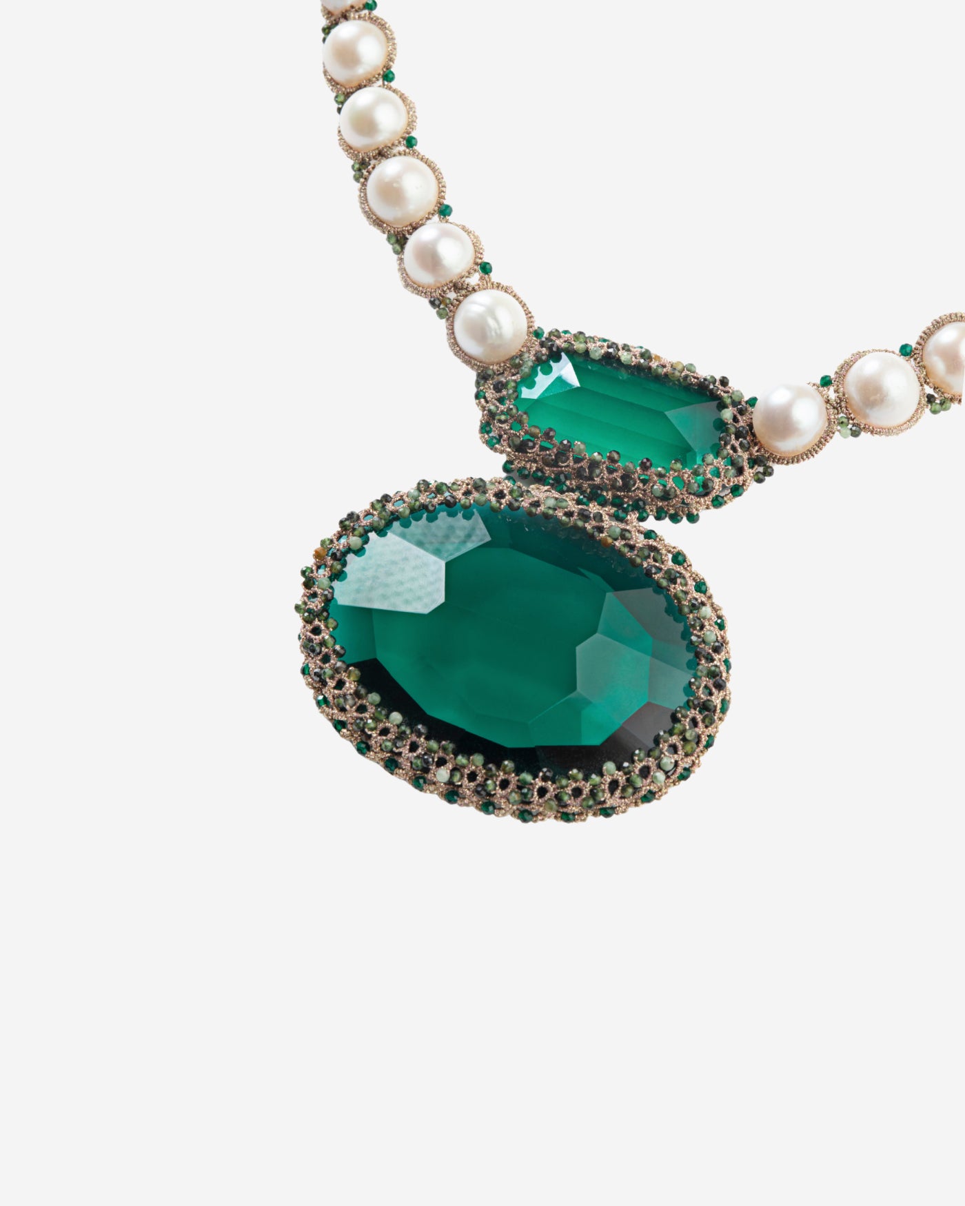 COMPOSITION: VINTAGE CRYSTAL, GREEN SAPPHIRE AND EMERALD GEMSTONES, FRESHWATER PEARLS, SILK AND METALLIZED THREADS, AND MOTHER OF PEARL BUTTON.