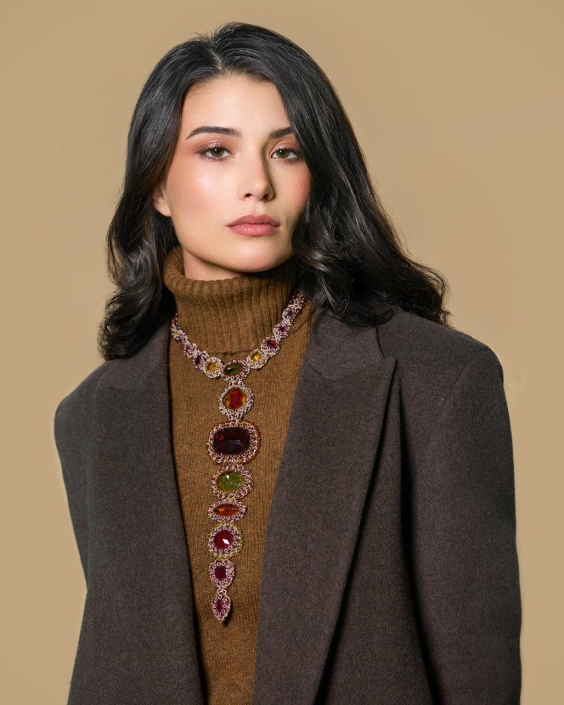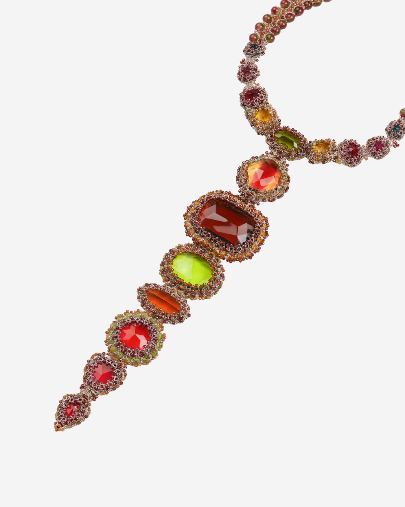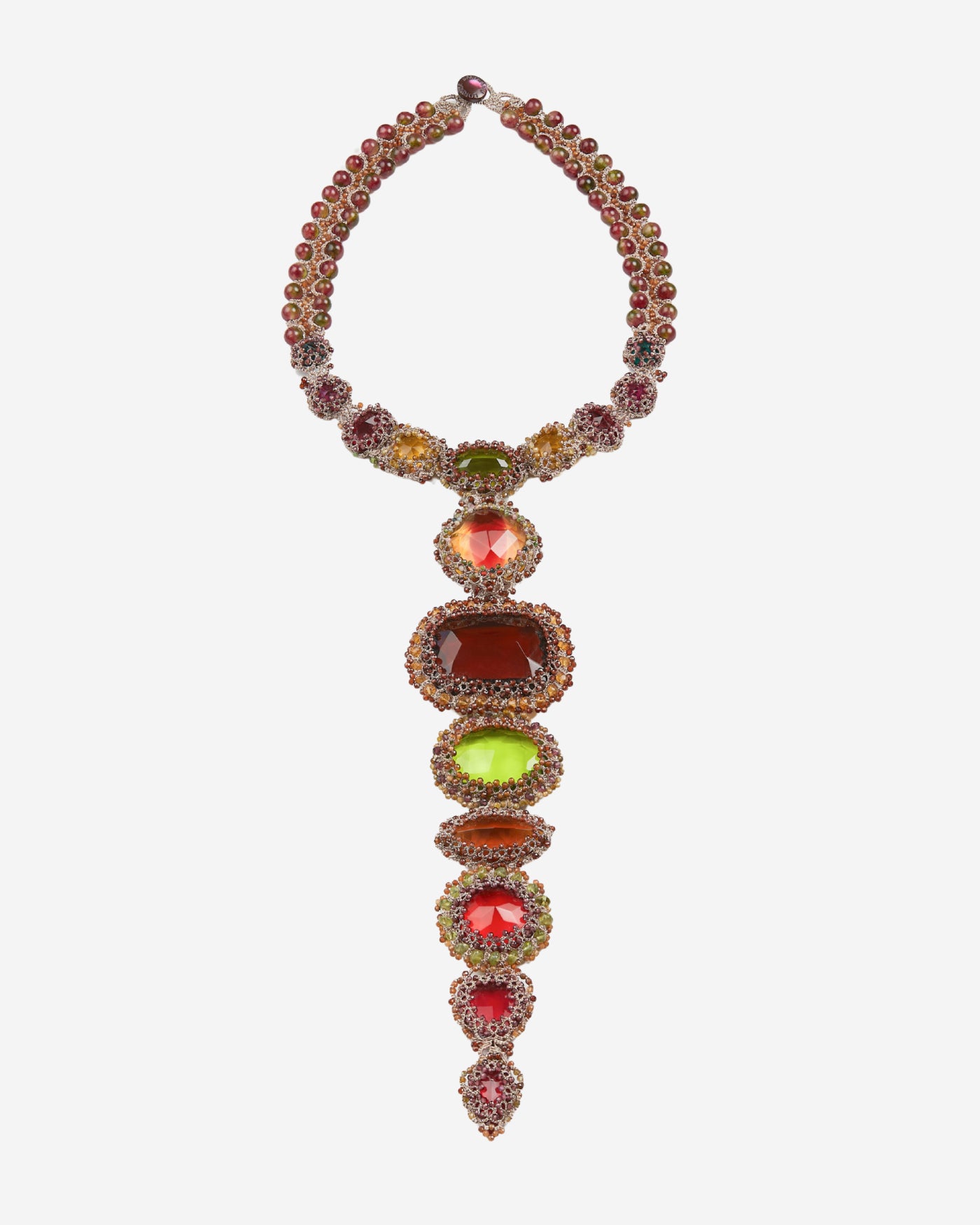 COMPOSITION: CRYSTAL, OBSIDIAN, GARNET, ORANGE GARNET, GREEN GARNET AND YELLOW TOURMALINE GEMSTONES, SILK AND METALLIZED THREADS, AND MOTHER OF PEARL BUTTON.