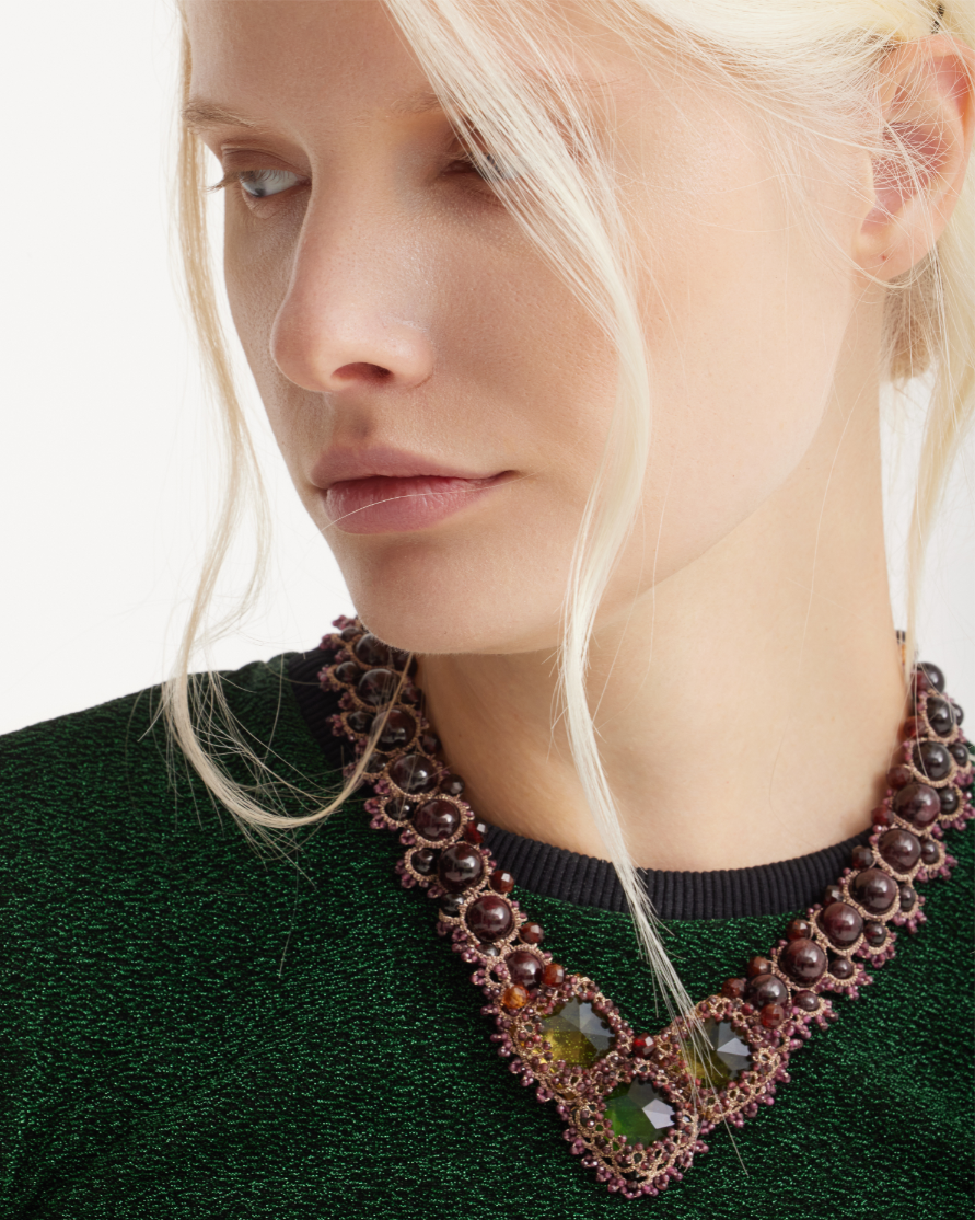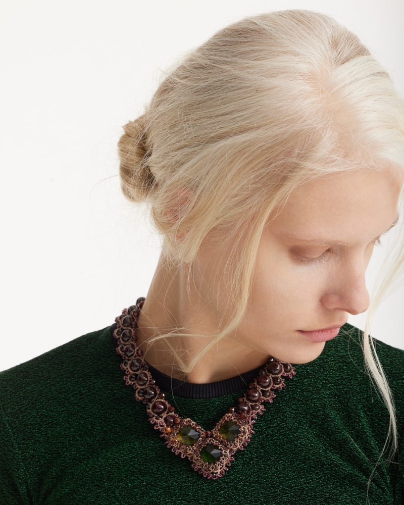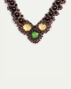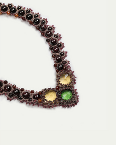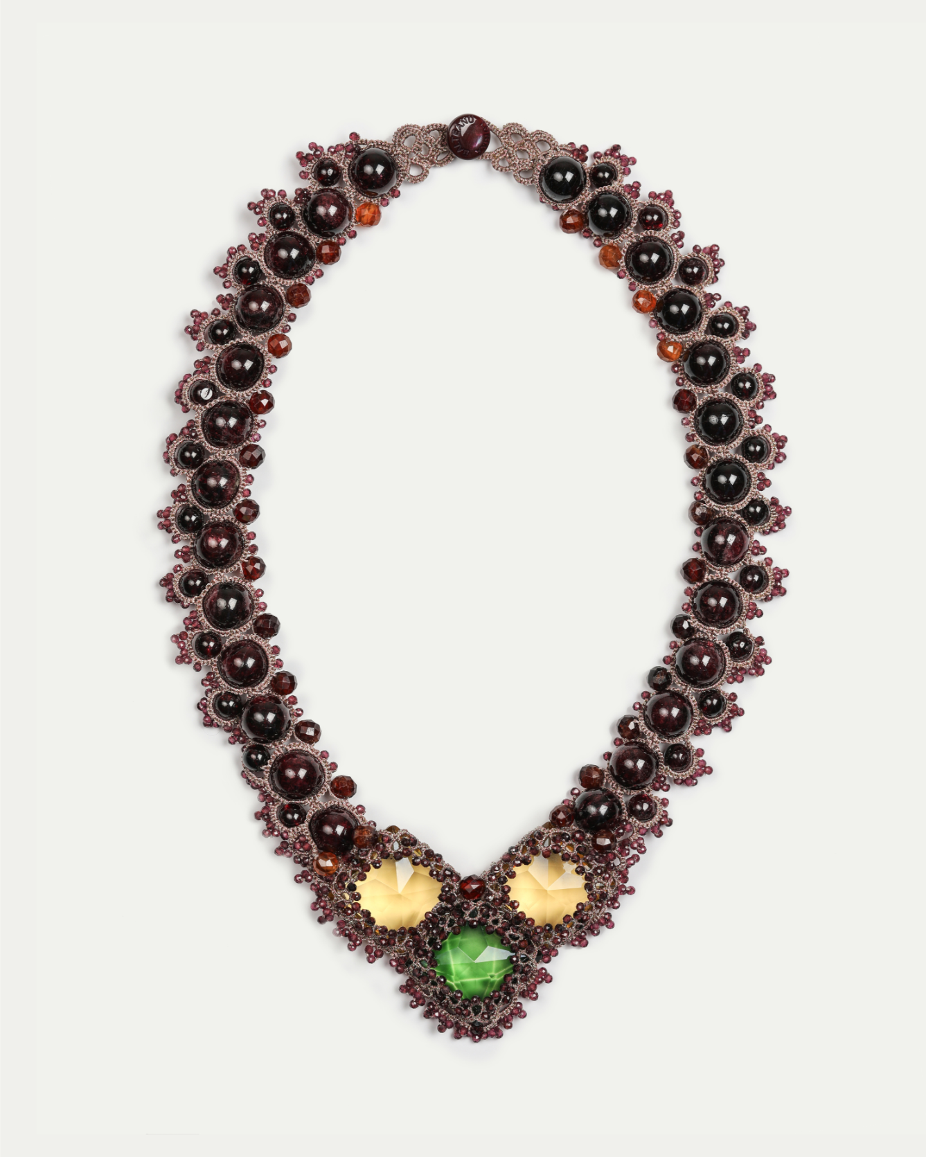 COMPOSITION: VINTAGE GLASS, GARNET GEMSTONES, SILK AND METALLIZED THREADS, AND MOTHER OF PEARL BUTTON.