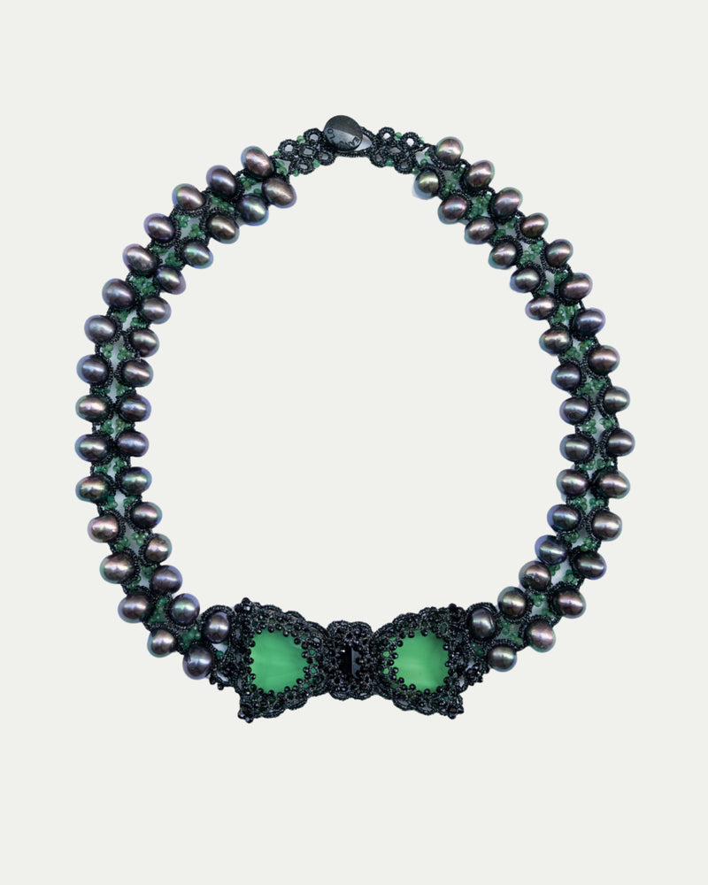 COMPOSITION: CRYSTAL, FRESHWATER PEARLS, SPINELLE AND EMERALD GEMSTONES, SILK AND METALLIZED THREADS, AND MOTHER OF PEARL BUTTON