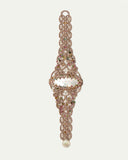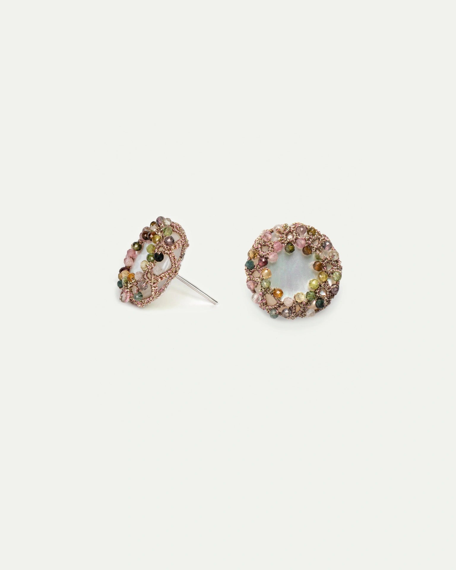 COMPOSITION: MOTHER OF PEARL CENTERPIECE, TOURMALINE GEMSTONES, FRESHWATER PEARLS, SILK AND METALLIZED THREADS.