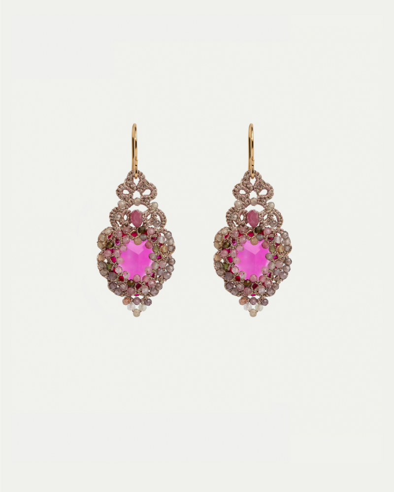 COMPOSITION: CRYSTAL, TOURMALINE, ROSE TOURMALINE, MULTICOLORED SAPPHIRE GEMSTONES, SILK AND METALLIZED THREADS, AND GOLD-PLATED SILVER HOOKS.