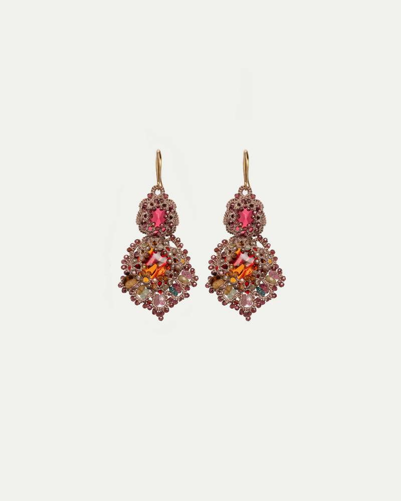 COMPOSITION: CRYSTALS, GARNET, MULTICOLORED SAPPHIRE AND TOURMALINE GEMSTONES, SILK AND METALLIZED THREADS, AND GOLD-PLATED SILVER HOOKS.