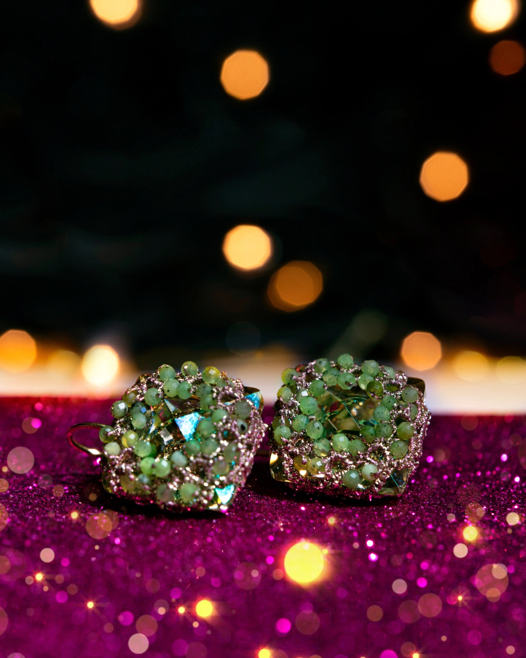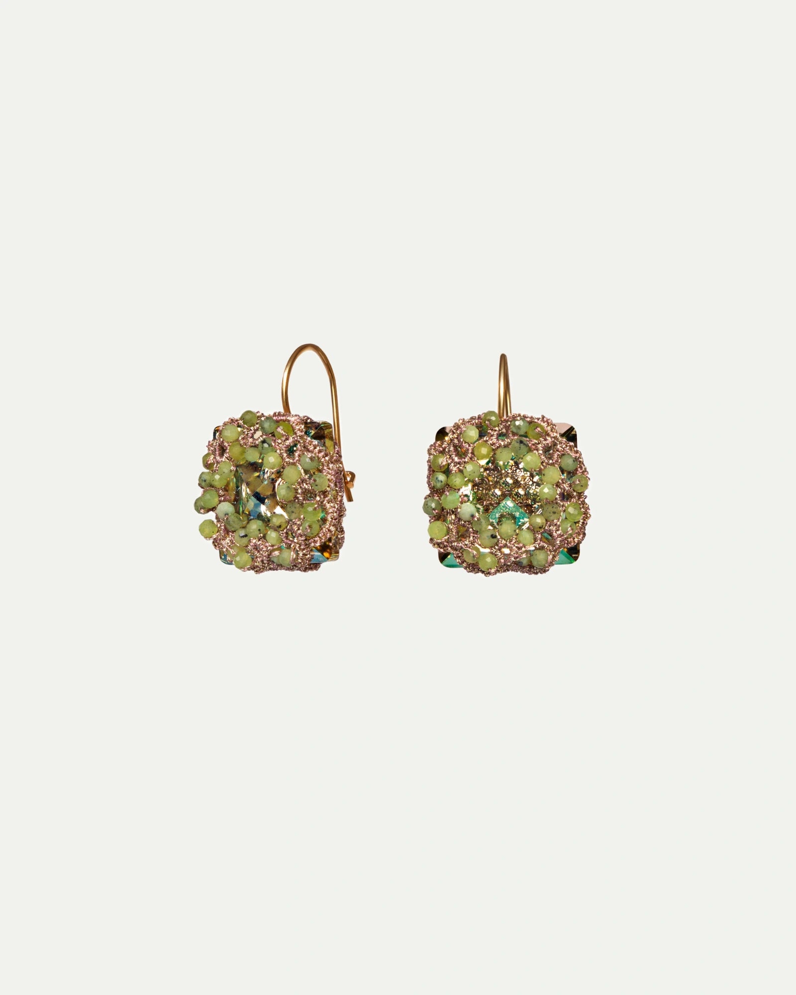 COMPOSITION: CRYSTAL, GREEN JADE GEMSTONES, SILK AND METALLIZED THREADS, AND GOLD-PLATED SILVER HOOKS.