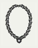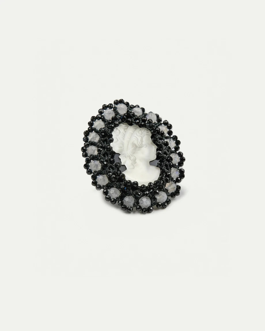COMPOSITION: CARVED VINTAGE GLASS, SPINEL AND MOONSTONE GEMSTONES, SILK AND METALLIZED THREADS, AND SILVER PIN.