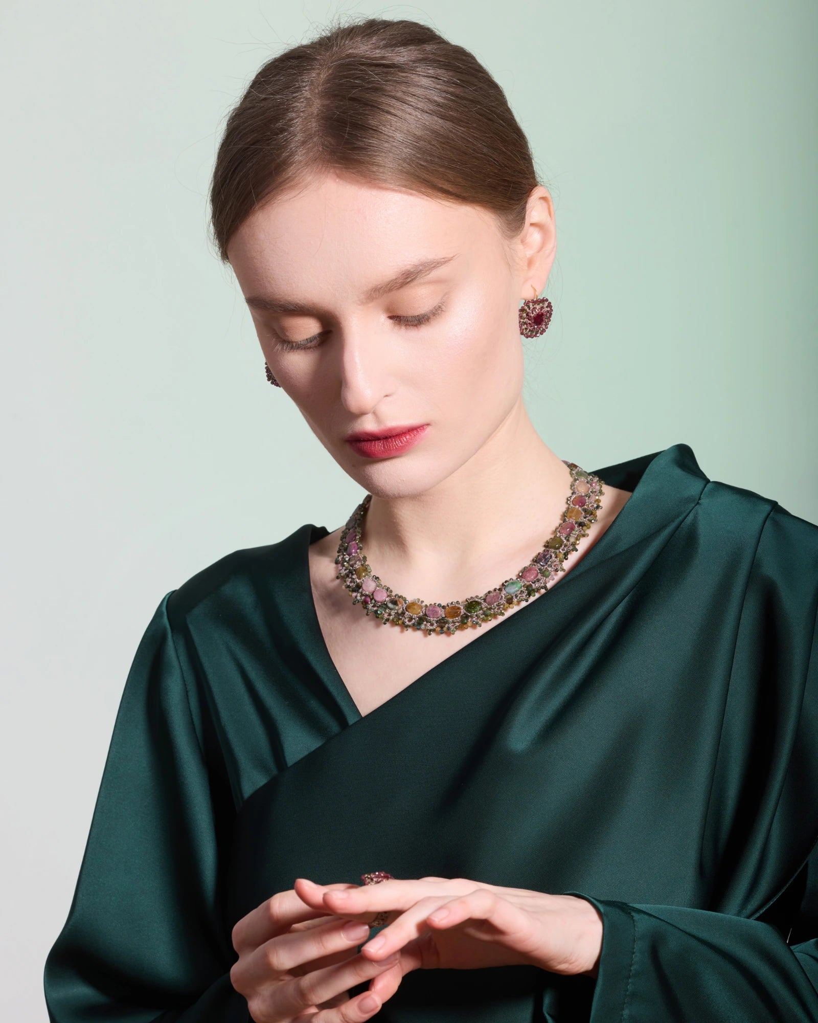 COMPOSITION: TOURMALINE AND GREEN TOURMALINE GEMSTONES, SILK AND METALLIZED THREADS, AND MOTHER OF PEARL BUTTON.