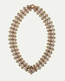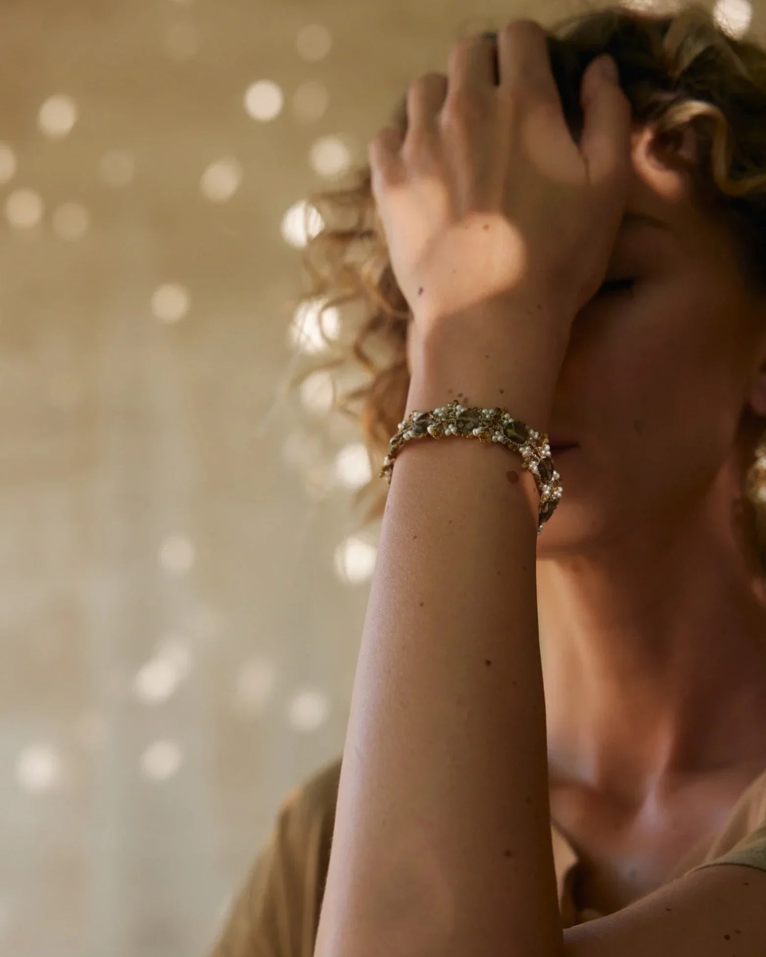 COMPOSITION: GREEN GARNET AND SMOKY QUARTZ GEMSTONES, FRESHWATER PEARLS, SILK AND METALLIZED THREADS, AND MOTHER OF PEARL BUTTON.