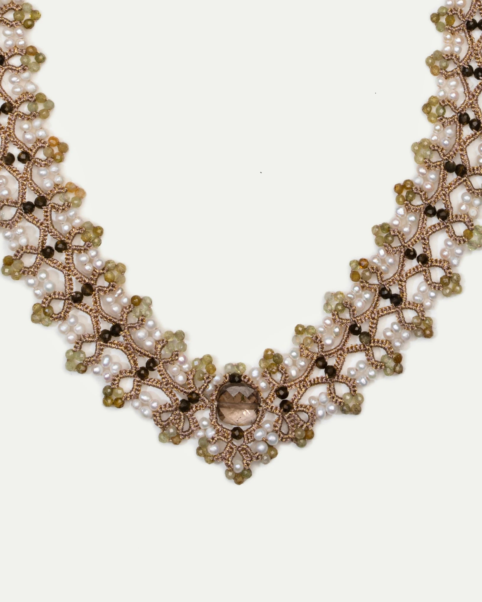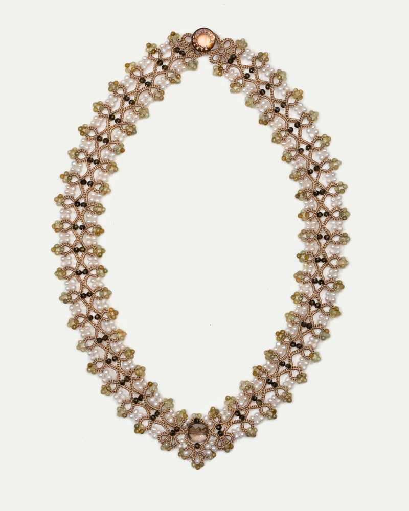 COMPOSITION: GREEN GARNET, OBSIDIAN AND SMOKY QUARTZ GEMSTONES, FRESHWATER PEARLS, SILK AND METALLIZED THREADS, AND MOTHER OF PEARL BUTTON.