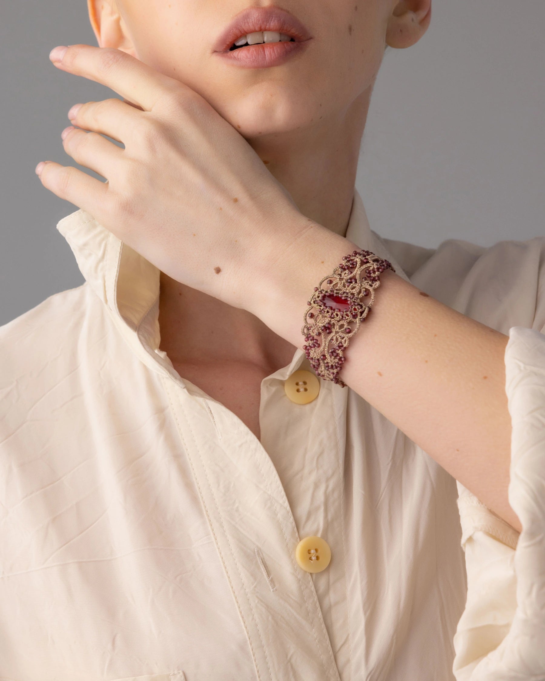 COMPOSITION: CRYSTAL, GARNET GEMSTONES, SILK AND METALLIZED THREADS, AND MOTHER OF PEARL BUTTON.