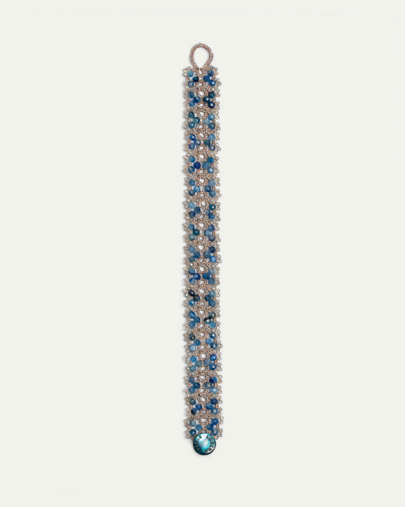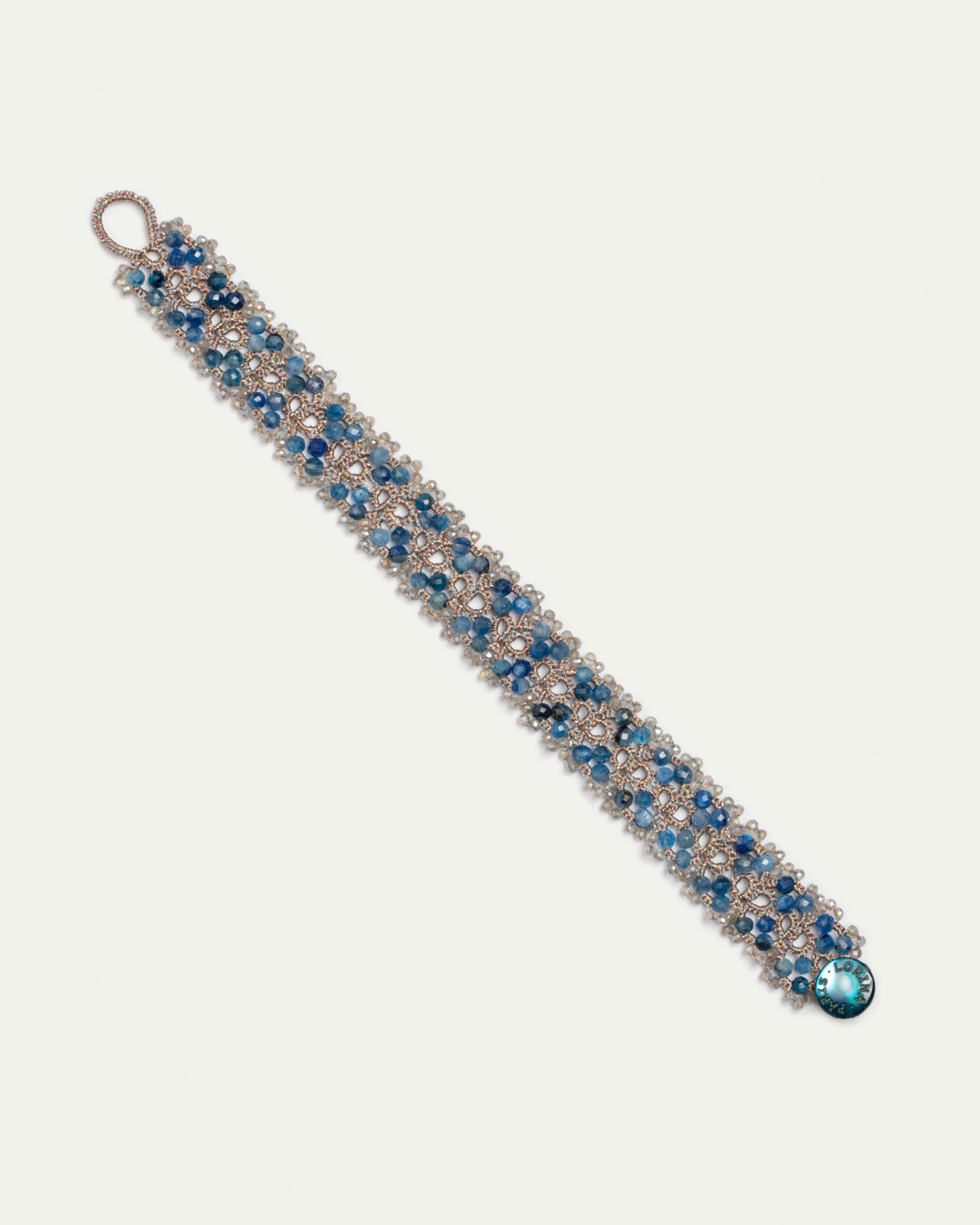 COMPOSITION: KYANITE AND LABRADORITE GEMSTONES, SILK AND METALLIZED THREADS, AND MOTHER OF PEARL BUTTON.