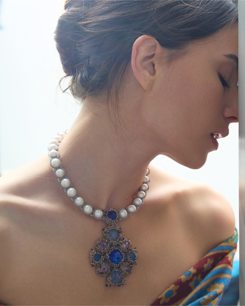 COMPOSITION: CRYSTALS, FRESHWATER PEARLS, KYANITE, AQUAMARINE AND MULTICOLORED SAPPHIRE GEMSTONES, SILK AND METALLIZED THREADS, AND MOTHER OF PEARL BUTTON.